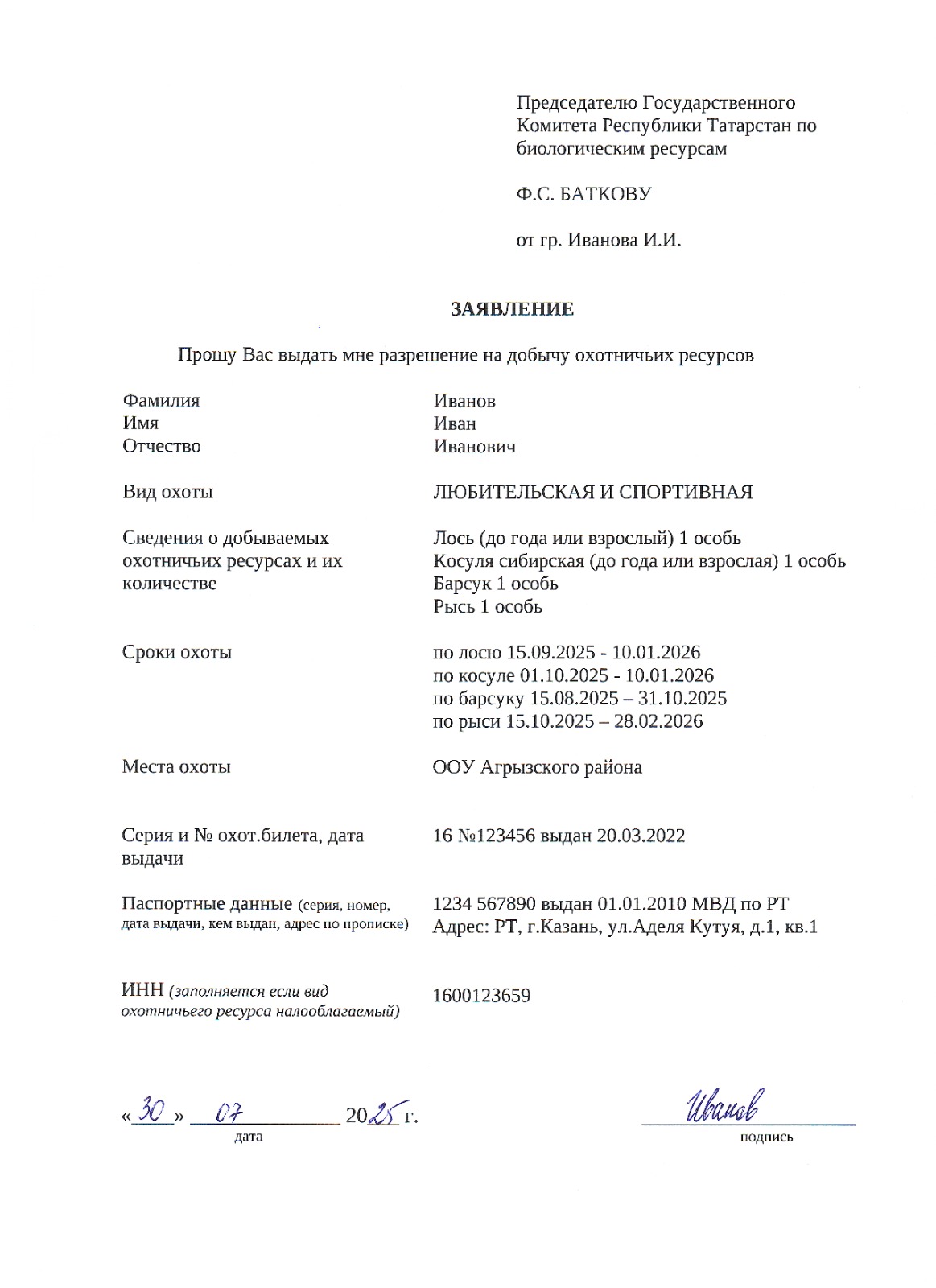 Заявление на получение разрешения на добычу охотничьих ресурсов